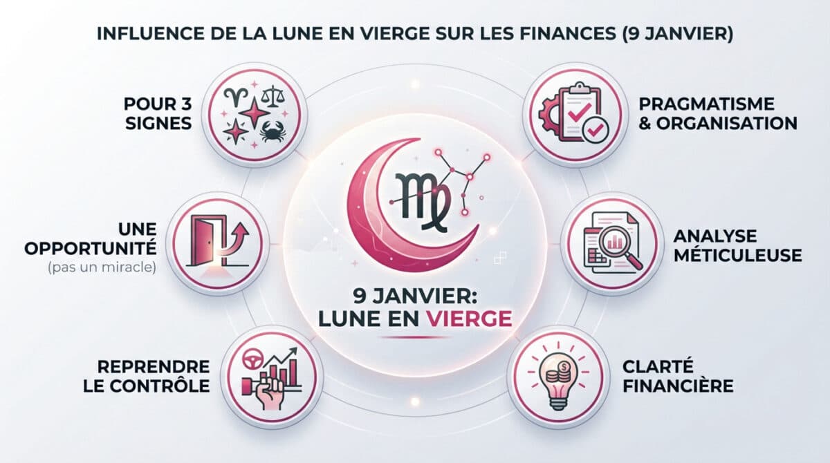 Le 9 janvier 2026 sonne la fin de vos tracas monétaires grâce à la Lune en Vierge. Cette énergie pragmatique offre une clarté indispensable pour remettre de l’ordre dans vos comptes. Vierge, Capricorne et Poissons sont en première ligne. Voyons comment l’astrologie signes financiers transforme concrètement votre gestion dès aujourd’hui.
