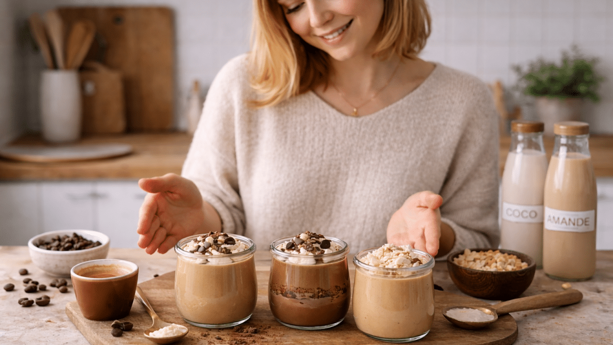 Pour quatre pots, je mesure 500 ml de lait entier, 35 g de fécule de maïs et 50 g de sucre de canne complet. Deux cuillères à soupe de café soluble ou un expresso serré viennent parfumer l’ensemble. J’aime parfois ajouter une cuillère de crème fraîche pour une sensation plus veloutée, mais la recette fonctionne parfaitement sans. Le fait qu’elle soit sans œufs simplifie tout, et élimine le risque de cuisson délicate.